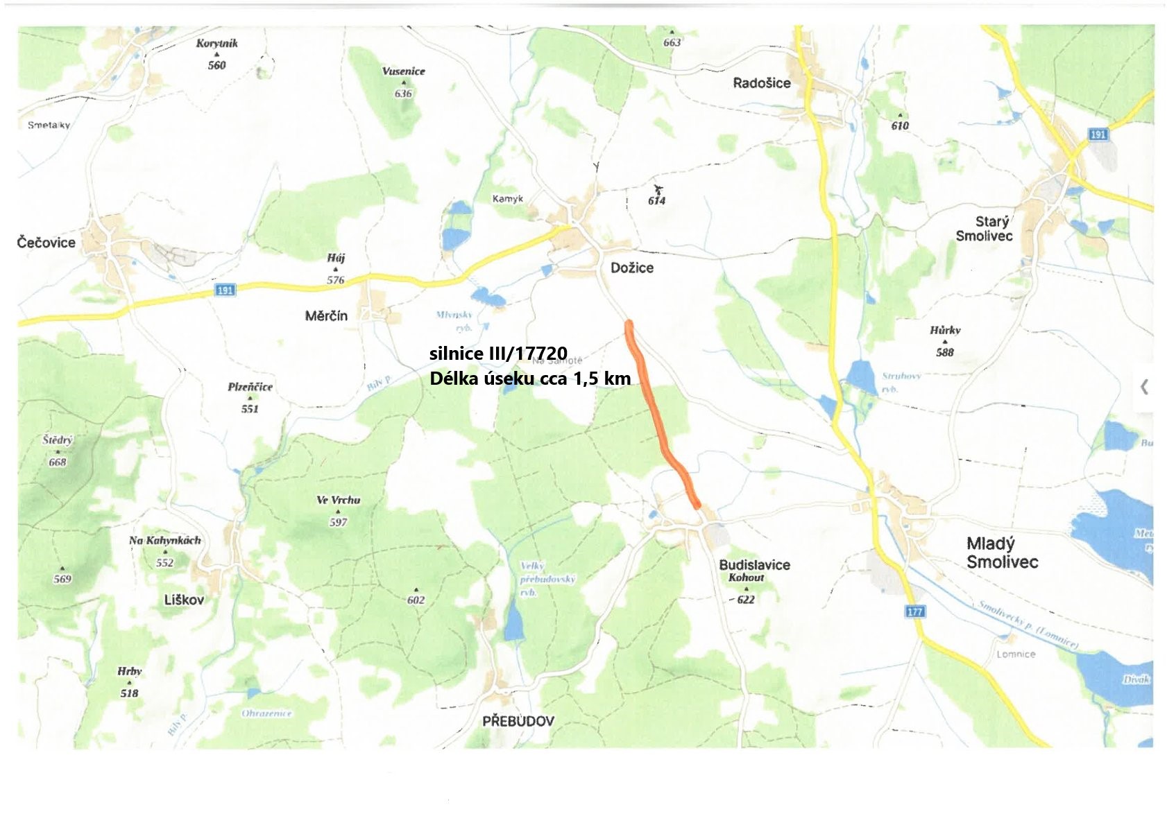 Stručný popis předmětu: Předmětem plnění veřejné zakázky je oprava povrchu komunikace III/17720 v úseku mezi obcemi Dožice a Budislavice, v délce cca 1,5 km. Budou provedeny úpravy napojení na MK, ZÚ a KÚ, očištění stávajícího povrchu, pokládka vyrovnávací vrstvy ACO a obrusné asfaltové vrstvy ACO 11 včetně spojovacích postřiků, stržení a dosypání krajnic, pročištění stávajících silničních příkopů. Součástí je zajištění dopravně inženýrského opatření.