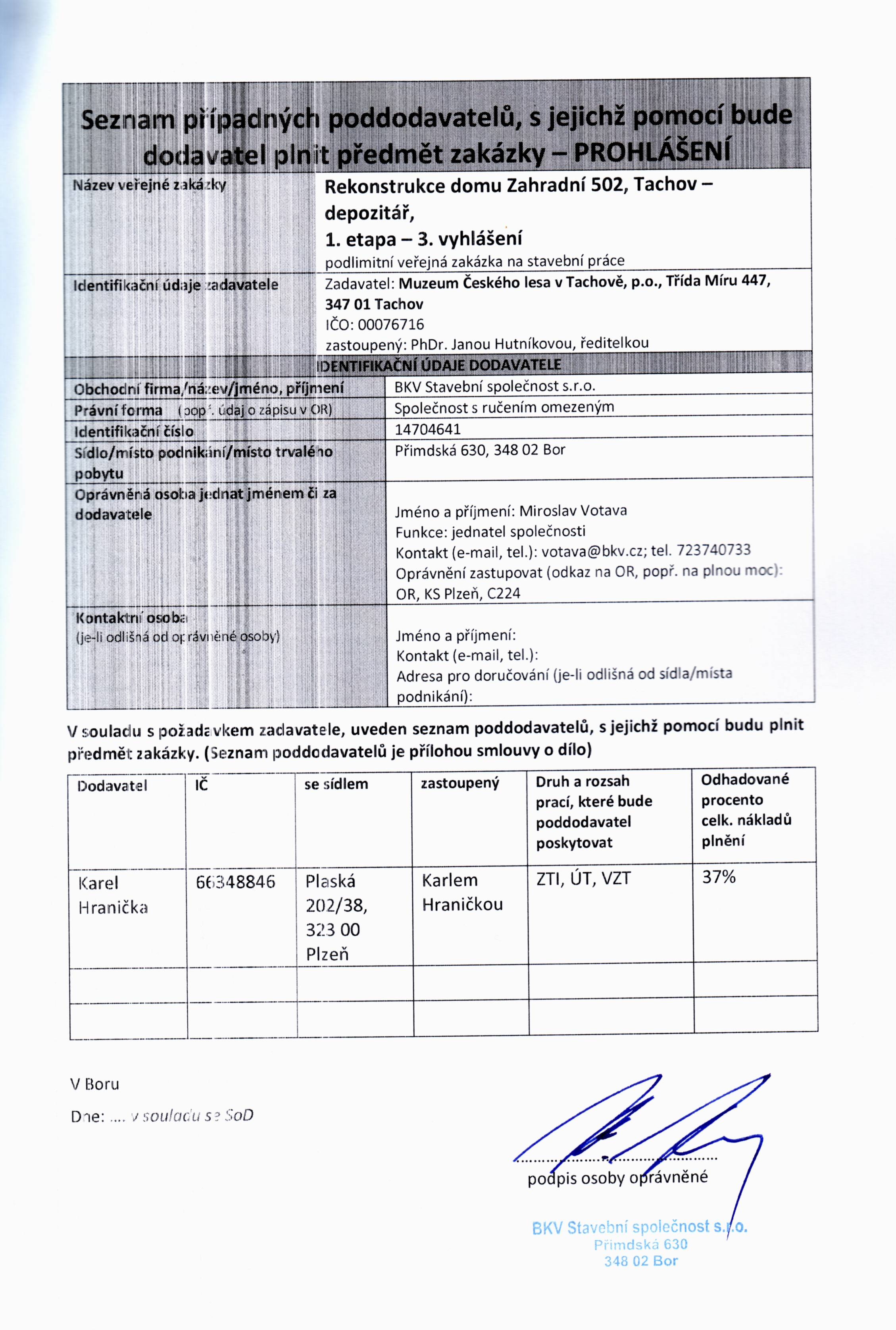 Příloha ke Smlouvě o dílo | Seznam poddodavatelů | ostatní dokumentace - veřejná |