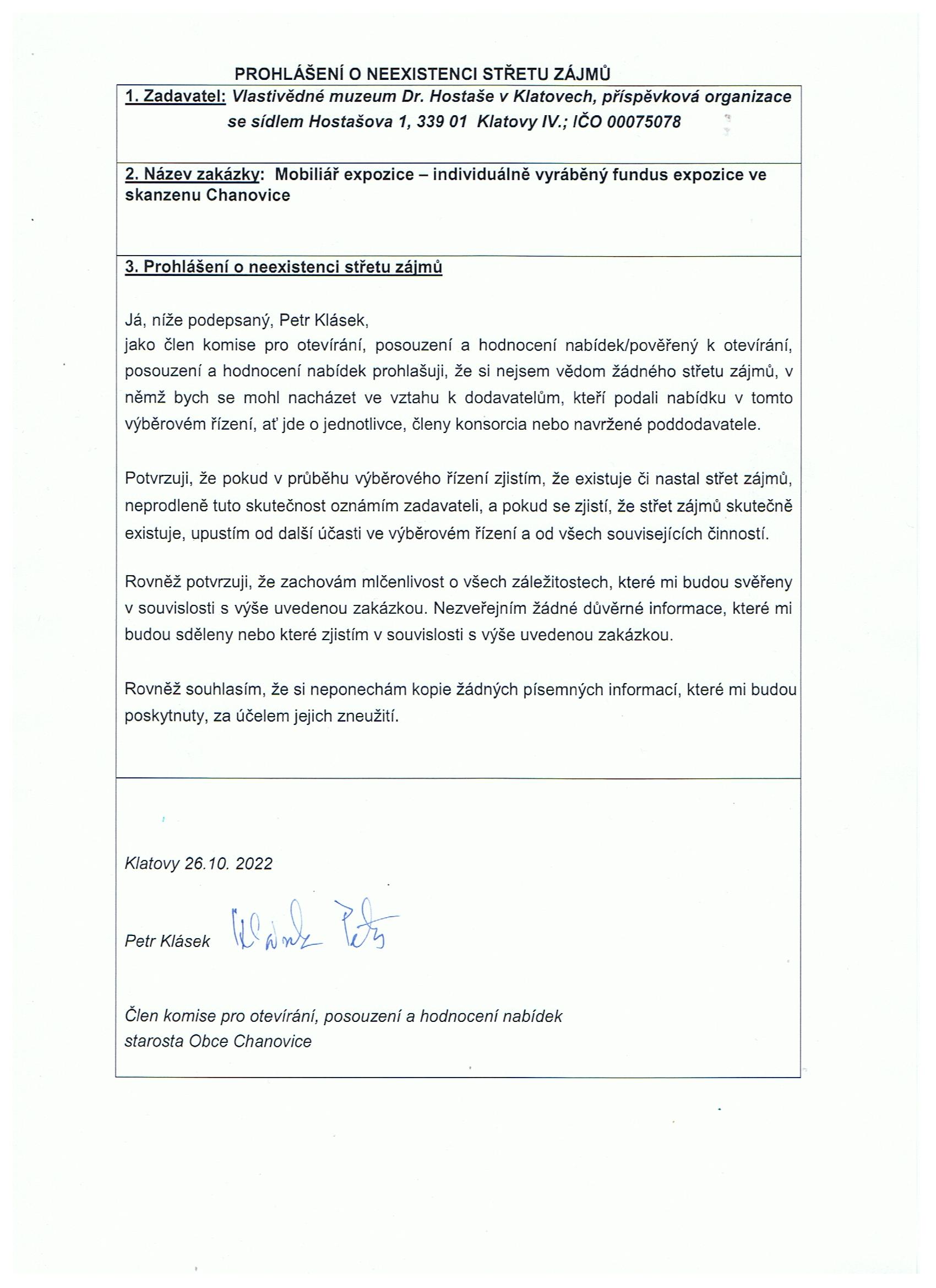 prohlášení o neexistenci střetu zájmu - p. Petr Klásek | Prohlášení o neexistenci střetu zájmu, zachování mlčenlivosti, neponechání si písemných informací. Prohlášení parafováno dne 26.10. 2022. | ostatní dokumentace - veřejná |