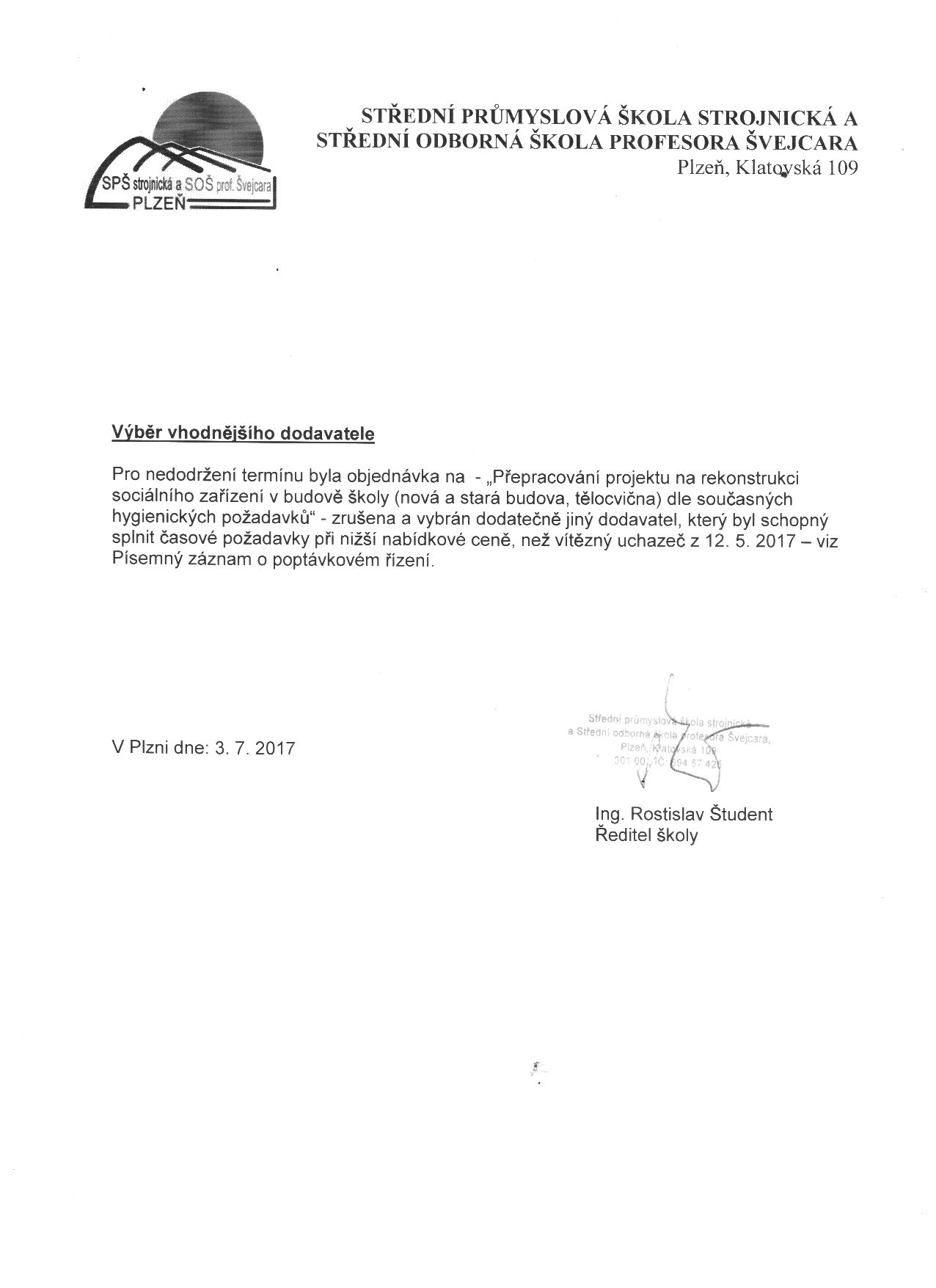 Oznámení o výběru dodavatele/nejvhodnější nabídky |